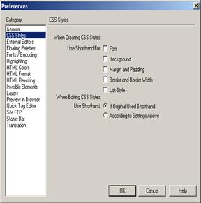 Следующая закладка поможет настроить то, как DreamWeaver работает с CSS(о том, что это такое и как создавать CSS будет указано ниже). Разница заключается в том, что - некоторые параметры CSS допускают так называемую "сокращенную" запись. Если необходимо сэкономить место и предпочтительней использовать подобный тип написания CSS, то достаточно включить все пункты на этой закладке.