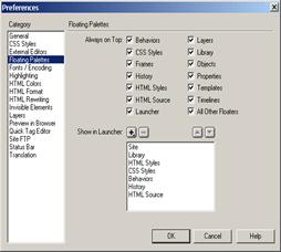 Закладка Floating Pallettes поможет настроить внешний вид DreamWeaver. Можно указать, какие из палитр будут всегда "висеть" над экраном документа, какие будут отображаться в "навигаторе панелей".