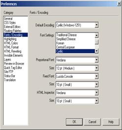 настроить правильно. Так, одним из наиболее оптимальных является выбор кодировки Windows-1251. Если настроить не так как нужно DreamWeaver просто начнет автоматически перегонять набранный текст в коды. То есть текст может выглядеть вот так: "iieiue eca?ao".