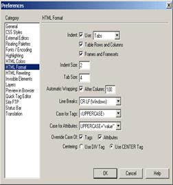 Одна из очень важных закладок – это HTML Format (формат HTML). Тоже немаловажный раздел. Здесь настраивается то, как будет выглядеть исходный HTML код после его сохранения DreamWeaver. В основном этот раздел настраивает "внешний" вид HTML - какие остступы использовать, какого размера, после какой колонки обрывать строку. Но есть и более важные пункты, например пункт Line Breaks настраивает каким символом должен обозначаться перевод строки.