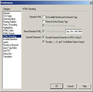 Пункт HTML Rewriting тоже важен. Если не правильно настроить его, можно наломать немало дров. Дело в том, что DreamWeaver снабжен парсером (проверочным модулем) который при открытии файла проверяет исходный HTML-код и делает выводы об ошибках в нем содержащихся. Иногда, то что DreamWeaver считает ошибкой таковой вовсе не является. Поэтому лучше пункты Rewrite HTML: Fix Invalidly Nested and Enclosed Tags и Remove Extra Closing Tags лучше убрать от греха подальше. Верно настроенный DreamWeaver все равно будет отображать "плохие" теги желтым цветом. И при желании можно их удалить вручную.