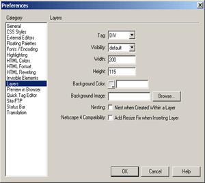 Пункт Layers помогает настроить параметры слоев, которые создаются в DreamWeaver. Лучше всего включить галочку Netscape 4 Compatibility во избежание проблем с отображением в Netscape. Многие Web-дизайнеры не рекомендуют пользоваться слоями вообще, так как пока они достаточно неоднозначно отображаются в разных версиях браузеров.