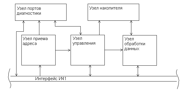 Модуль обеспечивает коррекцию одинарной и обнаружение двойной ошибки. На рис. показана структурная схема модуля. Узел приема осуществляет формирование адреса обращения к требуемой ячейке памяти при обращении к модулю со стороны интерфейса И41, узел обработки данных осуществляет прием и выдачу данных на (из) интерфейса И41. В его состав входит корректор, обеспечивающий при операциях записи формирование контрольных разрядов накопителя. При операциях чтения корректор формирует признаки одинарной и двойной ошибки и в случае одинарной ошибки производит коррекцию данных и выдачу их через соответствующий буферы на интерфейс И41. Узел управления формирует сигналы управления другими узлами модуля и соответствующую диаграмму. В его состав входит контроллер памяти КМ1810ВТ03, осуществляющий формирование управляющих сигналов для динамических микросхем памяти, прием и мультиплексирование адресов строки и столбца, а также формирует режим регенерации.