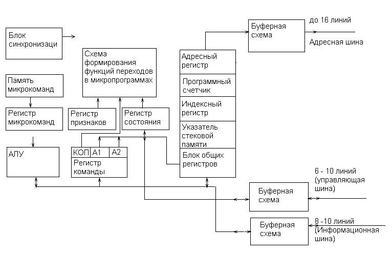 В структуре можно выделить три основные части: центральный процессор, блок управления и постоянная память микропрограмм. Центральный процессор содержит АЛУ, сверхоперативную память в виде программно доступных общих регистров и функциональные регистры – командный, индексный, адресный, указатель стека и программный счетчик. АЛУ состоит из двоичного сумматора, сдвигающего регистра, двух регистров операндов и регистра результата. Схемы АЛУ выполняют команды сложения, вычитания, логическое И, ИЛИ, сложение по модулю 2 и сдвигов. Более сложные операции реализуются программно. Блок микропрограммного управления содержит дешифратор кода операции, схему формирования функций перехода к следующему адресу в микропрограмме и регистр адреса микрокоманды. Система прерывания в микропроцессорах достаточно проста и предназначена только для восприятия прерываний от внешних источников. Микропроцессоры имеют упрощенные схемы управления ПУ. В значительной степени управление этими устройствами реализуется посредством микропрограммного управления. Блок постоянной памяти микропрограмм, реализующих команды микропроцессора, обычно выполняется в виде отдельной БИС. В микропроцессорах используют косвенную, непосредственную, индексную адресации основной оперативной памяти и прямую адресацию общих регистров. Сверхоперативная память на общих регистрах, позволяет сократить количество обращений к внешней памяти и уменьшить необходимое количество выводов корпуса за счет сокращения формата команды. Из-за ограниченного числа выводов корпуса БИС не удается реализовать интерфейс микропроцессора с высокой пропускной способностью. Поэтому микропроцессоры имеют так называемый общий интерфейс, обслуживающий как внешнюю оперативную память, так и ПУ. Если не удается выделить для интерфейса достаточное количество выводов, применяют мультиплексирование шин (использование шин для разных целей на основе разделения времени). Для обеспечения совместной работы микропроцессора и внешнего оборудования шины интерфейса снабжаются буферными схемами, в которых используются электронные схемы с тремя состояниями и спец. линии управления выдачи данных.