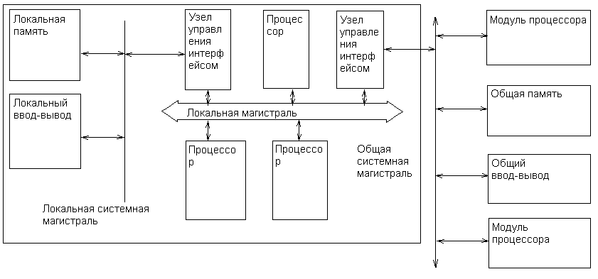 На рисунке показана типовая модульная структура системы, которую можно построить на базе микропроцессорных наборов К580 и К1810. Как видно из рисунка, возможны системные и локальные магистрали, объединяющие несколько процессоров. Микропроцессоры всегда связаны с локальной магистралью, а запоминающие устройства, устройства ввода-вывода и модули процессора – с системной магистралью. Локальная магистраль реализуется микропроцессором К1810ВМ86 и координирует работу нескольких процессоров и сопроцессоров. Так в модуле центрального процессора МЦП-16 микроЭВМ СМ 1810 локальная магистраль связывает микропроцессор К1810ВМ86 и сопроцессор i8087. Системная магистраль состоит из пяти наборов сигналов: адреса, данных, управления, прерывания арбитража. Интерфейс И41 – пример общей системной магистрали, которая позволяет координировать работу модулей, выполняющих различные функции. Возможна также локальная системная магистраль, не выходящая за пределы модуля процессора, но позволяющая присоединять дополнительные устройства непосредственно к процессору. Она недоступна со стороны модулей системы, объединенных общей системной магистралью. Локальная системная магистраль разгружает общую и позволяет процессорному модулю осуществлять обмен информацией со своими устройствами, освобождая общую системную магистраль для работы с другими модулями. Таким образом, процессоры, узлы управления интерфейсами, объединенные локальной магистралью, и устройства, объединенные локальной системной магистралью (в данном случае локальная память и локальный ввод вывод), образуют модуль процессора. Простейший модуль состоит из микропроцессора, узла управления локальным интерфейсом, объединяющим локальную память и управления локальными устройствами ввода- вывода. Описанная структура построения используется при проектировании одноплатных ЭВМ, не имеющих возможностей расширения. На рис. Показан модуль процессора, предназначенный для работы в расширяемой модульной многопроцессорной системе. Узлы управления общей системной магистралью обеспечивают доступ модуля к общей памяти и обмен информацией с другими процессорными модулями. Если в системе имеется несколько процессоров, то все запоминающие устройства и устройства ввода-вывода, подсоединенные к общей системной магистрали, доступны процессорным модулям. Арбитры магистрали КР1810ВБ89 в каждом модуле процессора обеспечивают доступ модулей к общей системной магистрали, следовательно, к общей памяти и устройствам ввода - вывода.
