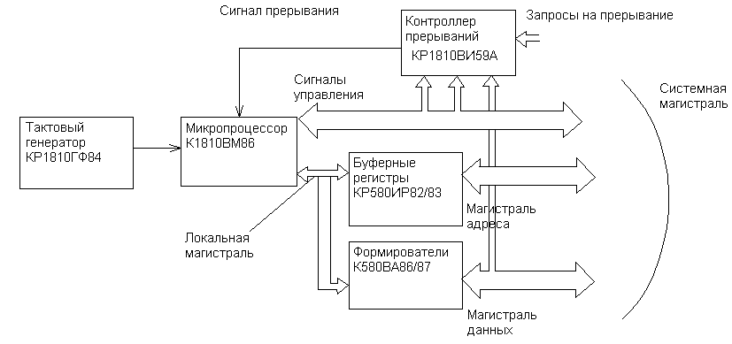 Контроллер прерываний К1810ВИ59А предназначен для обработки сигналов прерываний, поступающих от периферийных устройств, и работает совместно с основным микропроцессором К1810ВМ86. Он принимает запросы от восьми источников, при каскадном подключении дополнительных контроллеров ВИ59А число источников можно увеличить до 64. Тактовый генератор К1810ГФ84 предназначен для формирования сигналов частотой 5 МГц, синхронизирующих работу микропроцессора К1810ВМ86, кроме того, формирует сигналы СБРОС и ГОТОВНОСТЬ. Буферные 8 разрядные регистры КР580ИР82 и ИР83 используются при демультиплексирования магистрали адреса – данных микропроцессора К1810ВМ86. Формирователи магистрали 8 – разрядные КР580ВА86 и ВА87 предназначены для обеспечения необходимой мощности интерфейсных сигналов, выходящих за пределы платы, они представляют собой биполярные приемопередатчики с трех стабильными выходами. Контроллер магистрали КР1810ВГ88 предназначен для декодирования байта состояния микропроцессора КМ1810ВМ89 или ВМ86 (в максимальном режиме), осуществляет генерацию во времени команд и управляющих сигналов для системной магистрали. Он также выдает сигнал стробирования адреса в буферные регистры КР580ИР82 и ИР83 во время демультиплексирования адреса – данных от микропроцессора К1810ВМ86. Арбитр шины КР1810ВБ89 предоставляет системную магистраль одному из нескольких задатчиков, которые выставили запрос на захват магистрали для доступа к ресурсам системы, например общей памяти.