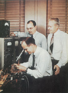 Вильям Шокли начал мечтать о полупроводниковом усилителе десятилетием раньше, но ему ничего не удавалось сделать до тех пор, пока в 1945 году в лабораторию Белла не пришел блестящий теоретик Джон Бардин. Он вначале сидел в одной комнате с не менее блестящим экспериментатором Уолтером Браттейном, занимающимся полупроводниками аж с 1930 года. Будучи полной противоположностью друг другу по склонностям и темпераменту, они сдружились на почве общего дела и частой игры в гольф. Именно их совместная работа в подразделении Шокли и привела к открытию.