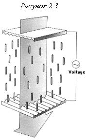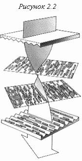 Экран LCD монитора представляет собой массив маленьких сегментов (называемых пикселями), которыми можно манипулировать для отображения информации. LCD монитор имеет несколько слоев, где ключевую роль играют две панели, сделанные из свободного от натрия и очень чистого стеклянного материала, называемого субстрат или подложка, которые собственно и содержат тонкий слой жидких кристаллов между собой [см. рис. 2.1]. На панелях имеются бороздки, которые направляют кристаллы, сообщая им специальную ориентацию. Бороздки расположены таким образом, что они параллельны на каждой панели, но перпендикулярны между двумя панелями. Продольные бороздки получаются в результате размещения на стеклянной поверхности тонких пленок из прозрачного пластика, который затем специальным образом обрабатывается. Соприкасаясь с бороздками, молекулы в жидких кристаллах ориентируются одинаково во всех ячейках. Молекулы одной из разновидностей жидких кристаллов (нематиков) при отсутствии напряжения поворачивают вектор электрического (и магнитного) поля в световой волне на некоторый угол в плоскости, перпендикулярной оси распространения пучка. Нанесение бороздок на поверхность стекла позволяет обеспечить одинаковый угол поворота плоскости поляризации для всех ячеек. Две панели расположены очень близко друг к другу. Жидкокристаллическая панель освещается источником света (в зависимости от того, где он расположен, жидкокристаллические панели работают на отражение или на прохождение света).
