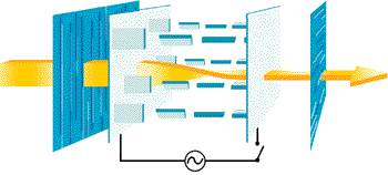 Поворот плоскости поляризации светового луча незаметен для глаза, поэтому возникла необходимость добавить к стеклянным панелям еще два других слоя, представляющих собой поляризационные фильтры. Эти фильтры пропускают только ту компоненту светового пучка, у которой ось поляризации соответствует заданному. Поэтому при прохождении поляризатора пучок света будет ослаблен в зависимости от угла между его плоскостью поляризации и осью поляризатора. При отсутствии напряжения ячейка прозрачна, так как первый поляризатор пропускает только свет с соответствующим вектором поляризации. Благодаря жидким кристаллам вектор поляризации света поворачивается, и к моменту прохождения пучка ко второму поляризатору он уже повернут так, что проходит через второй поляризатор без проблем [см. рис 2.4а].