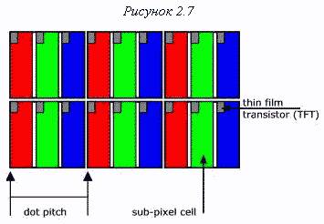 Пиксель на основе TFT устроен следующим образом: в стеклянной пластине друг за другом интегрировано три цветных фильтра (красный, зеленый и синий). Каждый пиксель представляет собой комбинацию трех цветных ячеек или субпиксельных элементов [см. рис. 2.7]. Это означает, например, что у дисплея, имеющего разрешение 1280x1024, существует ровно 3840x1024 транзистора и субпиксельных элемента. Размер точки (пикселя) для 15.1" дисплея TFT (1024x768) приблизительно равен 0.0188 дюйма (или 0.30 мм), а для 18.1" дисплея TFT - около 0.011 дюйма (или 0.28 мм).