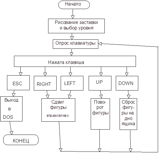В состав программы входят функции отображения на экране двужущихся фигурок, параллельного переноса их вправо и влево, поворота вокруг собственной оси, быстрого падения на дно короба и ряд вспомогательных функций (контроль наложения фигур, отображение элементов фигур и т.д.).