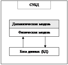 Под даталогической понимается модель, отражающая логичес кие взаимосвязи между элементами данных безотносительно их содержания и физической организации. При этом даталогическая модель разрабатывается с учетом конкретной реализации СУБД, также с учетом специфики конкретной предметной области на основе ее инфологической модели. Для конкретной реализации даталогической модели проектируется физическая модель (рис. 2), oтображающая первую на конкретные программные и аппаратные средства (ОС, внешняя память, работа с данными на физическом уровне и т.д.). Наполненная конкретной информацией физическая модель и составляет собственно БД. Система, обеспечивающая cо ответствующее совместное функционирование указанных компонентов и составляет суть конкретной СУБД.