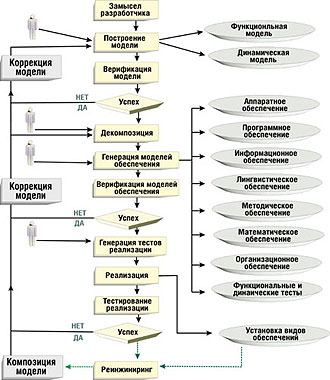 Можно говорить о "бездефектном" проектирования информационных систем. Оно достигается комплексным применением высокоуровневого моделирования (моделирования функций или бизнес-процессов) предприятия и низкоуровневого моделирования вычислительной системы. Общая условная схема бездефектного проектирования информационной системы приведена на рис. 1.