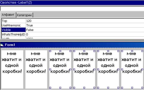 Рассматриваем ту же задачу, те же коробки, с использованием тех же массивов элементов ( ... но "как-то по-другому ..." ). Всё таже форма, всё тот же Label 1(0) , всё таже клавиатура ... На метке выполняем комбинацию клавиш Ctrl + C , затем Ctrl + V (отвечая положительно на появившийся вопрос диалогового окна среды разработки). Разместите появившуюся метку правее от имевшейся метки. Повторите ещё: Ctrl + V и разместите правее второй. Продолжайте повторение до тех пор пока не разместите метку Label 1(9) правее метки Label 1(8) . Теперь выделите имеющиеся метки с индексами больше единицы. И измените свойства этих меток на противоположное - False. Label1(1) и Label1(0) поменяйте местами.