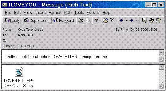 Интернет – червь I LOVE YOU (в дальнейшем будем для удобства называть его «вирус») проникает в систему при получении по электронной почте письма с темой I LOVE YOU и присоединенным файлом LOVE LETTER FOR YOU.TXT.VBS., в котором содержится код вируса. При прочтении данного письма программой MS Outlook файл с телом вируса получает управление.