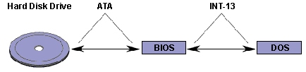 Первоначальная версия стандарта IDE обеспечивала возможность подключения к компьютеру четырех винчестеров и позволяла обмениваться данными с диском на скорости до 10Мбайт/сек, однако реальная скорость ограничивалась прежде всего возможностями самого винчестера. Подключение четырех устройств, предусмотренное спецификацией IDE, в компьютерах семейства IBM PC AT, в спецификации ATA/IDE реализовано не было. Кроме того, совместное использование стандарта ATA и программного интерфейса Int 13 BIOS ограничивало размер дисковых устройств 528Мб. Природу этого ограничения, связанную с форматами чисел, используемых для адресации головок, секторов и цилиндров винчестера (CHS-адрес) в стандарте IDE и BIOS, можно понять из приведенной ниже таблицы и рисунка 2, иллюстрирующего взаимодействие операционной системы с диском IDE.