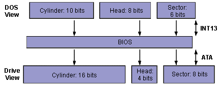 Существует два способа преодолеть ограничение размера диска. Первый способ заключается в использовании трансляции адресов CHS (цилиндр-головка-сектор) - пересчета реальных значений в фиктивные, удовлетворяющие ограничениям BIOS. Контроллер и BIOS используют в этом случае разную геометрию для адресации данных на диске. Если диск содержит 1500 секторов и имеет 16 головок, то в результате трансляции BIOS будет воспринимать его как устройство с 750 цилиндрами и 32 головками.