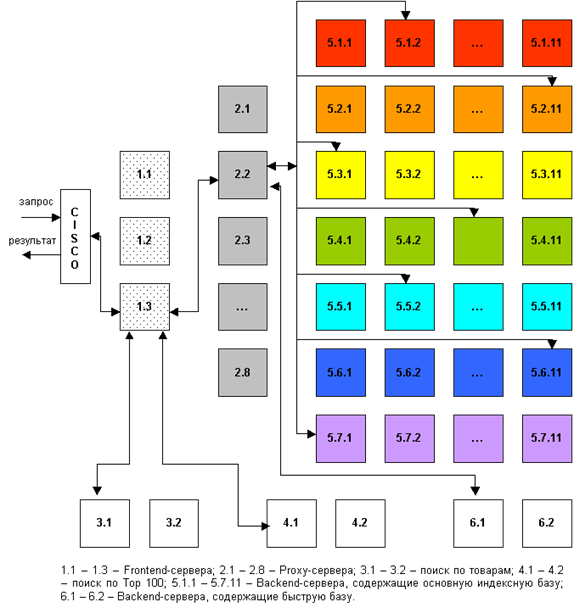 Запрос поступает в поисковую систему через маршрутизатор Cisco 6000 series. Cisco передает его наименее загруженной машине первого уровня - frontend (1.1 - 1.3, на рис. машине 1.3). Frontend, в свою очередь, отправляет запрос дальше, на один из восьми proxy-серверов, также выбирая наиболее свободный сервер (2.1 - 2.8, на рис. машине 2.2). Одновременно frontend отправляет запрос на машины, осуществляющие поиск по товарам (3.1 - 3.2, на рис. машине 3.1) и по базе Тор 100 (4.1 - 4.2, на рис. машине 4.1). На proxy проводится поиск по ссылочному индексу, и его результаты вместе с поисковым запросом передаются на машины, которые содержат основную индексную базу, - backends (5.1.х - 5.7.х, на рис. машинам 5.1.2, 5.2.11, 5.3.1 и т.д.) Та же информация отправляется на машины с "быстрой базой" (6.1 - 6.2, на рис. 6.1).