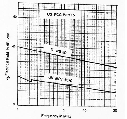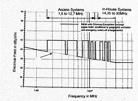 Пределы для PLC-сигналов даны на время в двух формах: как ограничения на излучаемые поля или как ограничения на уровень сигнала в сети. Рисунок 4 демонстрирует допустимые пределы для полей, излучаемых PLC-сигналами, определяемые различными национальными властями. Британские требования более жесткие, американские — более мягкие.