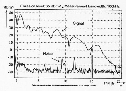 PLC-системы не должны нарушать работу других устройств, подключенных к той же сети. Защищенность таких устройств против проводимого «шума» в частотном диапазоне от 0,15 до 80 Мгц обеспечивается Общим стандартом EMC. Это намного больше, чем уровень сигнала PLC (см. параграф 5.6 ниже) и опасность такого воздействия исключена.