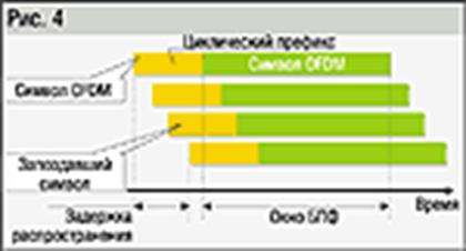 Еще одним преимуществом OFDM является ее устойчивость к так называемому эффекту многолучевого запаздывания. Он вызывается тем, что излученный сигнал, отражаясь от препятствий, приходит к приемной антенне разными путями. Это может привести к искажениям за счет межсимвольной интерференции. Для ослабления эффекта многолучевого запаздывания символы передаются с большим периодом. Устойчивость может быть повышена путем добавления защитного временного периода между передаваемыми символами. Обычно используют циклическое расширение -- конечную часть волны, кодирующей символ, добавляют к начальной части. Это увеличивает длину символа, не нарушая ортогональности. Кроме того, циклическое расширение позволяет выбрать окно для преобразования Фурье в любом месте временного интервала символа (рис. 4).