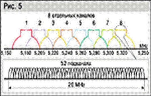 Высокая скорость передачи достигается за счет группировки множества низкоскоростных подканалов (поднесущих). Это выполняется следующим образом. Две нижние зоны делятся на восемь неперекрывающихся каналов шириной 20 MHz. В свою очередь, каждый канал разбивается на 52 подканала по 300 kHz (рис. 5). Из них 48 подканалов используются для передачи данных, а остальных четыре -- для кодов коррекции ошибок. Устройства, удовлетворяющие стандарту 802.11a, должны поддерживать скорости передачи 6, 9, 12, 18, 24, 36, 48 или 54 Mbps. Такое многообразие скоростей достигается с помощью применения различных схем кодирования. Так, на нижнем уровне иерархии скоростей используется бинарная фазовая модуляция (Binary Phase Shift Keying -- BPSK). Она обеспечивает пропускную способность подканала 125 Kbps, что, умноженное на 48, дает 6 Mbps для одного канала. Квадратурная фазовая модуляция (QPSK) удваивает это значение, доводя его до 12 Mbps.