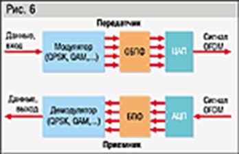 При формировании OFDM-сигнала необходимо обеспечить ортогональность поднесущих. Поэтому сначала, исходя из характера входных данных, определяются требуемый частотный спектр и необходимая схема модуляции. Каждая поднесущая связывается со своим подпотоком данных. Амплитуда и фаза поднесущей вычисляются на основе выбранной схемы модуляции (BPSK, QPSK или QAM). Затем с помощью обратного преобразования Фурье (ОПФ) амплитуда как функция фазы преобразуется в функцию от времени (преимущественно используется вариант обратного быстрого преобразования Фурье ¾ ОБПФ). Принимающая аппаратура с помощью БПФ преобразует амплитуду сигналов как функцию от времени в функцию от частоты, генерируя при этом набор ортогональных синусоид (рис. 6).