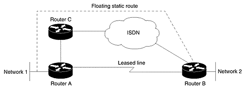 На этом рисунке основным путем из сети 1 в сеть 2 является выделенная линия между маршрутизаторами А и В. Однако, возможен и другой путь, проходящий через коммутируемое соединение. В случае обрыва выделенной линии маршрутизатор А перенаправит весь трафик на маршрутизатор С, а тот, в свою очередь, передаст его маршрутизатору B. При восстановлении работоспособности выделенной линии динамический маршрут перекроет плавающий статический маршрут, и путь следования трафика вновь станет таким, каким он было до обрыва.