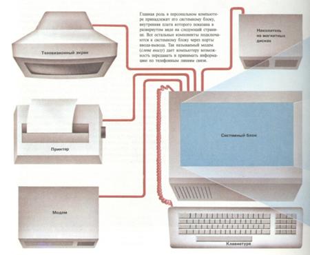 ЭВМ состоит из нескольких основных компонентов. Каждому из основных компонентов вычислительной системы отведены определённые функции, которые выполняются определённым способом. Два таких компонента впервые были описаны в 1833 году Чарльзом Бебиджем в проекте Аналитической машины. Бебидж ввёл название устройства, названного «мельницей», в котором производятся действия над величинами, и понятие запоминающего устройства, «склад», где хранятся значения величин и результаты выполняемых «мельницей» операций. В наше время – это соответственно арифметико-логическое устройство (АЛУ) и оперативное запоминающее устройство (ОЗУ). АЛУ является частью процессорного устройства компьютера, которое выполняет инструкции, а так же управляет информацией, поступающей в машину от таких устройств, как клавиатура или световое перо, и выводимой из неё, например, на печатающее устройство (принтер) или телевизионный экран (видеомонитор). Все компоненты компьютера в основном работают по принципу последовательной обработки данных. Идёт ли речь о персональном компьютере или о мощном суперкомпьютере, оба они решают задачи в незамысловатой последовательной манере, шаг за шагом, в каждый момент времени, анализируя и исполняя только одну инструкцию, после чего переходят к следующей. Даже решение простеньких задачек – типа сложить два и два, или перейти от строчных букв к прописным – требует сотен мелких процедур. Но каждый такой крошечный шаг совершается быстрее, чем в «мгновение ока», и буквально за считанные секунды эти бесчисленные мелкие операции слагаются в решение задачи, – будь то вывод на экран упорядоченного по алфавиту списка или изображение сбитого летательного аппарата, напавших на Землю инопланетян в увлекательной видеоигре. В мгновение ока можно побывать в крупных музеях, – рассматривая картины известных художников, произведения известных скульпторов; библиотеках – читая оригиналы книг любого писателя или поэта и т.д. не выходя из дома используя связь Интернет.