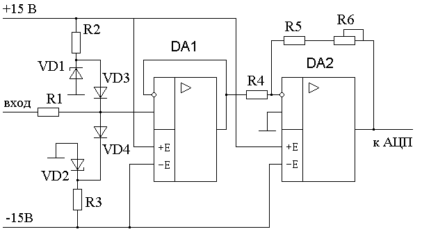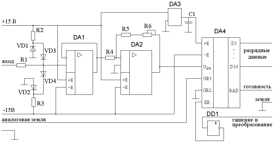 Устройство сопряжения построено на современной элементной базе. Оно осуществляет преобразование аналогового сигнала (от датчика поворота гантри) в цифровой, который затем через параллельный порт вводиться в ЭВМ. Оцифровка сигнала осуществляется с помощью функционально-завершенного аналого-цифрового преобразователя К1113ПВ1А. Подгонку аналогового сигнала под параметры аналого-цифрового преобразователя осуществляется с помощью двух прецизионных операционных усилителей К140УД25. Предусмотрены меры по защите дорогостоящей микросхемы аналого-цифрового преобразователя от превышения уровня входного аналогового сигнала, и от неодновременной подачи на нее входных сигналов. Питание устройства осуществляется от блока питания симулятора (используются напряжения 15 В).