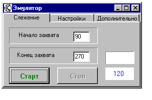 Программная часть комплекса представляет собой программу, написанную в среде Delphi, и работающую под управлением операционной системы Windows-95. Программа получает данные от аналого-цифрового преобразователя и осуществляет управление его работой. Далее считанные данные преобразуются в значение угла поворота гантри. Программа опрашивает аналого-цифровой преобразователь примерно через каждые 50 мс. Одновременно через такой же интервал она сравнивает угол поворота гантри с заданными углами начала и конца записи видеосигнала. По достижении заданных углов происходит эмуляция нажатия на клавиши Enter или Escape, что соответственно запускает или останавливает программу захвата видеопоследовательности. Программа допускает настройку под аппаратную часть, а также задание произвольных углов начала и конца сканирования.