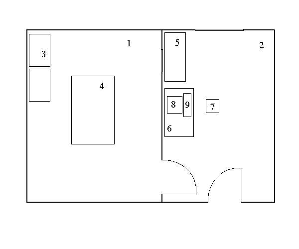 5 – пульт управления, 6 – рабочий стол, 7 – рабочий стул, 8 – монитор, 9 –