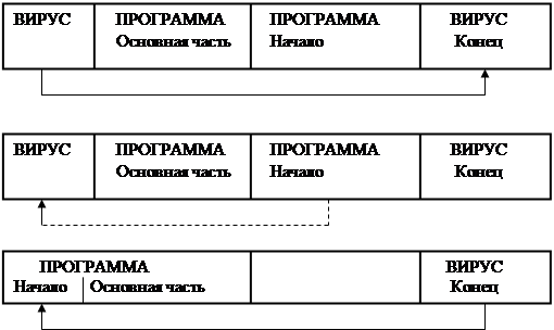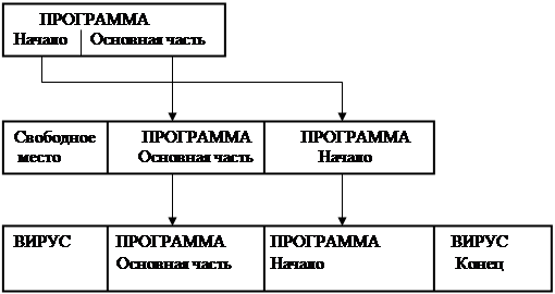 Тело вируса записывается в начало файла, а часть вируса обеспечивающая восстановление программы – в конец