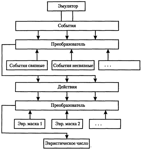 5. Еще несколько особенностей, с которыми иногда можно встретиться при дизассемблировании кода вируса и изучении листинга. Код вируса может быть зашифрован. В этом случае в начале вирусного кода должен располагаться расшифровщик. Вообще говоря, расшифровщиков может быть много, но первый всегда существует. Если расшифровщик меняется от одного зараженного файла к другому, значит имеем дело с полиморфным вирусом. Вырожденныйслучай - зашифровываются только сохраненные в теле вируса байты. Для СОМ-файла вполне достаточно пошагово пройти расшифровщик в отладчике, дождаться его завершения и сохранить на винчестер расшифрованный код вируса. Полученный файл можно дизассемблировать. Для ЕХЕ-файла такое не подходит, так как впамяти после загрузки отсутствует заголовок, и полученный файлне может быть дизассемблирован именно как ЕХЕ. Вероятно, придется писать специальную программу расшифровки на основе изу-ченного по листингу алгоритма расшифровщика. Расшифровщик может быть совмещен с алгоритмами, противодействующими трассировке кода вируса с использованием отладчиков. Ознакомиться с ними можно в специальной литературе, посвященной борьбе с НСК. Авторы вирусов, как правило, редко изобретают что-то новое и используют широко известные методы. Эвристические анализаторы кода Эвристическим анализатором кода называется набор подпрограмм, анализирующих код исполняемых файлов, памяти или загрузочных секторов для обнаружения в нем разных типов компьютерных вирусов. Рассмотрим универсальную схему такого кодо анализатора. Действуя в соответствии с этой схемой, кодоанализатор способен максимально эффективно задействовать всю информацию, собранную для тестируемого объекта. Основные термины: Событие - это совокупность кода или вызов определенной функции операционной системы, направленные на преобразование системных данных, работу , с файлами или часто используемые вирусные конструкции. Цепочка связных событий - это набор событий, которые должны быть выявлены в порядке их следования. Цепочка несвязных событий - это набор событий, которые должны быть выявлены, но не обязательно в строгом порядке. Действия - набор цепочек связных или несвязных событий, для которых выполнены все условия. Эвристическая маска - набор действий, выявленных при проверке файла.Эвристическое число - порядковый номер первой из совпавших эвристических масок. События распознаются при помощи подпрограмм выявления событий, в которых могут использоваться также таблицы с данными. Остальные данные просто хранятся в массивах и не анализируются. Рассмотрим функциональную схему эвристического анализатора Эмулятор кода работает в режиме просмотра, то есть его основная задача - не эмулировать код, а выявлять в нем всевозможные события. События сохраняются в таблице событий по алгоритму: