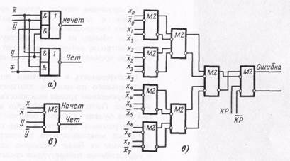 При построении схем определения четности суммы 1 слова используют логические элементы с парафазным выходом, подобные изображенному на рис. 1, a) и б). Показанные схемы выполняют операцию сложения по модулю 2 (условное обозначение М2) для двоичных переменных х и у. На рис. 1, в показана схема определения признака четности байта.