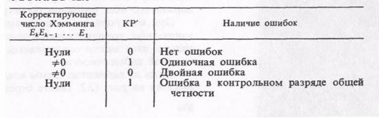 Модифицированный код Хэмминга. К контрольным разрядам Хэмминга добавляется еще один (в последнем примере восьмой) разряд КР контроля четности всех одновременно считываемых (записываемых) информационных и контрольных разрядов. При считывании формируются корректирующее число Ek Ek -1 ... E 1 , и разряд общей четности КР' для всех считанных разрядов, включая КР. Модифицированный код Хэмминга позволяет устранять одиночные и обнаруживать двойные ошибки, как это следует из табл. 1.
