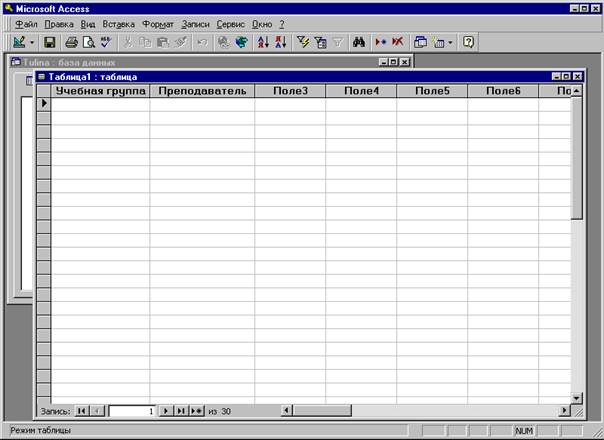 Все составляющие базы данных, такие как таблицы, отчеты, запросы, формы и объекты, в Access хранятся в едином дисковом файле. Основным структурным компонентом базы данных является таблица. В таблицах хранятся вводимые нами данные. Внешне каждая таблица Access похожа на таблицы, с которыми мы привыкли работать на бумаге, - она состоит из столбцов, называемых полями , и строк, называемых записями . Количество записей в таблице ограничивается емкостью жесткого диска. Допустимое количество полей – 255. Таблиц в базе данных может быть несколько. Каждая запись таблицы содержит всю необходимую информацию об отдельном элементе базы данных. Например, запись о преподавателе может содержать фамилию, имя, отчество, дату рождения, должность и т.п.
