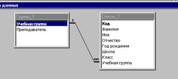 · В появившемся окне Добавление таблицы выделим таблицу Группы и щелкнем по кнопке Добавить. Выделим таблицу Список и щелкнем по кнопке Добавить. В окне Схема данных появится условный вид этих таблиц. Щелкнем по кнопке Закрыть окна Добавление таблицы.