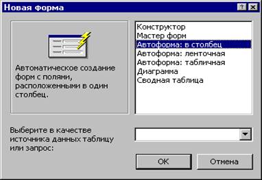 Появится диалоговое окно (рис.6), в котором следует выбрать Автоформа в столбец , а в качестве источника данных – Список .