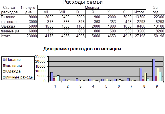 После занесения всех сведений о текущих расходах в таблицу, построим диаграмму, отражающую изменение помесячных расходов семьи или диаграмму, отражающую структуру расходов (долю) каждого члена семьи.