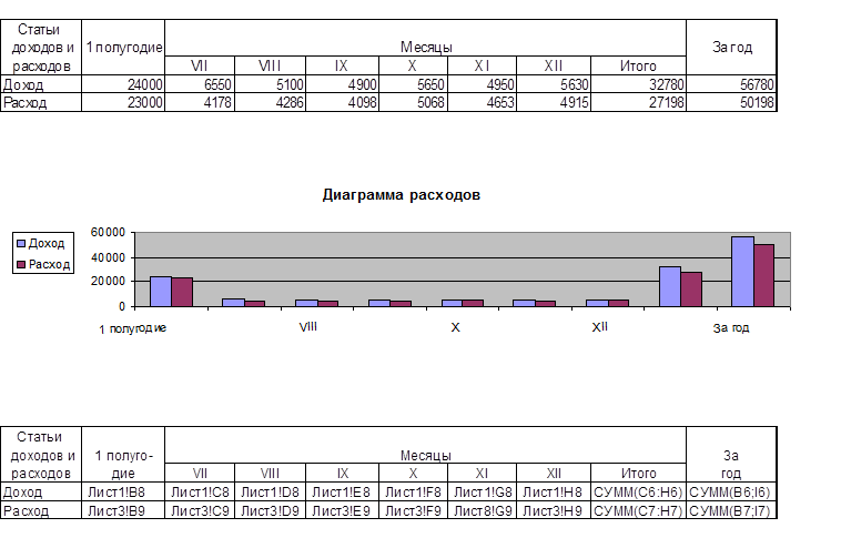 Все расчеты производятся за второе полугодие текущего года. Таблицы снабжаются диаграммами. Все электронные таблицы помещаются на листах одной рабочей тетради. Каждый лист входящий в одну книгу должен содержать одну таблицу и иметь соответствующее имя: “Доходы”, “Расходы” и т.д.