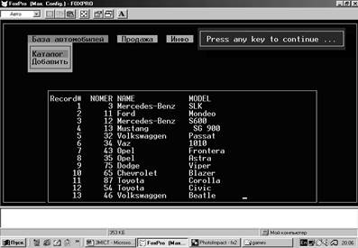 При виконанні пункту меню “База автомобілів” пункту “Каталог”, на екрані з’являється вікно з переліком автомобілів та деяких їхніх параметрів, які знаходяться у базі даних на даний момент.Користувачу будуть рекомендовані такі дані, як:Номер,Назва,та Модель автомобілів.При натисненні клавіші Enter вікно автоматично закриється.