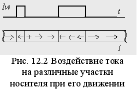 Для горизонтальной магнитной записи МГ записи имеет небольшой зазор, через который замыкается магнитный поток. Под действием тока в обмотке домены носителя ориентируются в одном направлении. Если изменить направление тока записи Iw , то ориентация доменов будет противоположной (рис. 12.2). Количество переходов, размещаемых на единице площади носителя, называют физической плотностью записи. Этот параметр зависит от метода магнитной записи, величины зазора в МГ и ее конструкции, расстояния между МГ и покрытием носителя и др.