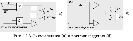 Чтобы создать магнитный поток МГ, в ее обмотке должен протекать ток Iw или -Iw в процессе записи, а чтобы предотвратить разрушение записанной информации при хранении и считывании, ток записи должен отсутствовать. Этого можно добиться с помощью следующей схемы (рис. 12.3,а). МГ записи имеет две обмотки W1 и W2 , включенные встречно. При наличии разрешающего сигнала записи WR ток от источника через резистор R протекает по обмотке W1 , переводя носитель в одно из состояний намагниченности. Противоположное состояние намагниченности создается при протекании тока 2Iw по обмотке W2. Этот ток формируется усилителем записи при наличии сигнала разрешения записи и сигнала от схем кодирования.