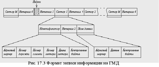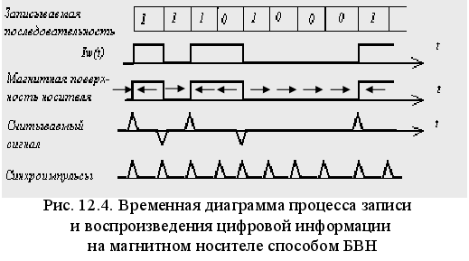 Рассмотрим наиболее распространенный способ записи – «без возврата к нулю». Суть этого способа состоит в том, что при записи «1» направление тока изменяется, а при записи «0» - не изменяется и отпечатков на поверхности носителя не остается. Запись и чтение осуществляются при постоянной скорости перемещения носителя. Для воспроизведения «0» и отделения их от «1» используются синхроимпульсы (рис. 12.4), которые при считывании могут воспроизводиться автономным тактовым генератором или считываться как служебная информация со служебной дорожки носителя.