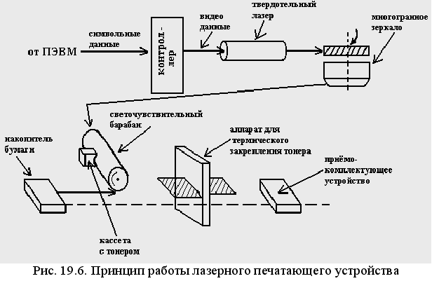 Принцип действия лазерных печатающих устройств схож с принципом действия электростатических копировальных устройств (рис. 19.6).