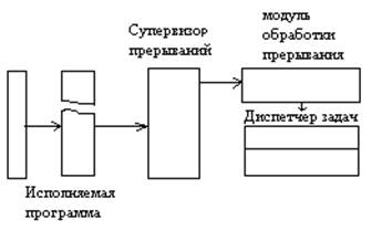 Сей модуль сохраняет в дескрипторе текущей задачи рабочие регистры процессора, которые определяют контекст прерываемого вычислительного процесса. Определяет ту подпрограмму, которая должна выполнять действия связанные с обслуживанием текущего запроса на прерывание. Перед тем. как передать управление этой подпрограмме супервизор прерываний устанавливает необходимый режим обработки прерывания. После выполнения подпрограммы управление передается вновь супервизору, но уже на тот модуль, который занимается диспетчеризацией задач. Диспетчер задач в свою очередь, в соответствии с принятым режимом распределения процессорного времени между выполняющимися процессами восстановит контекст той задачи, которой будет решено выделить процессор.