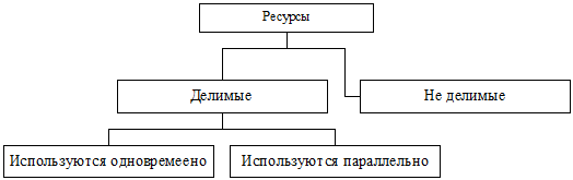 Ресурсы могут быть разделяемыми, когда несколько процессов могут использовать их одновременно (в один и тот же момент времени) или параллельно (в течение некоторого времени процессы используют ресурс попеременно) и неразделяемыми.