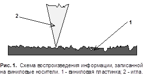 Приводился в действие механизм, вра-щающий пластинку, и ставилась игла на пластинку. Игла плавно плыла по канавкам, прорубленным в пластинке, издавая при этом различные звуки — в зависимости от глубингы канавки, её ширины, наклона и.т.д., используя явление резонанса. А после труба, находившаяся около самой иголки, усиливала звук, “высекаемый” иголкой. (рис. 1)