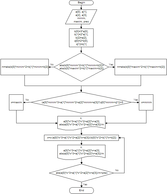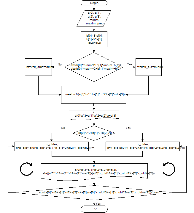 Ниже приведена блок-схема алгоритма и листинг программы, реализующей данный алгоритм на языке С++. Также привожу текст, которая выдает данная программа при решении исходного уравнения.